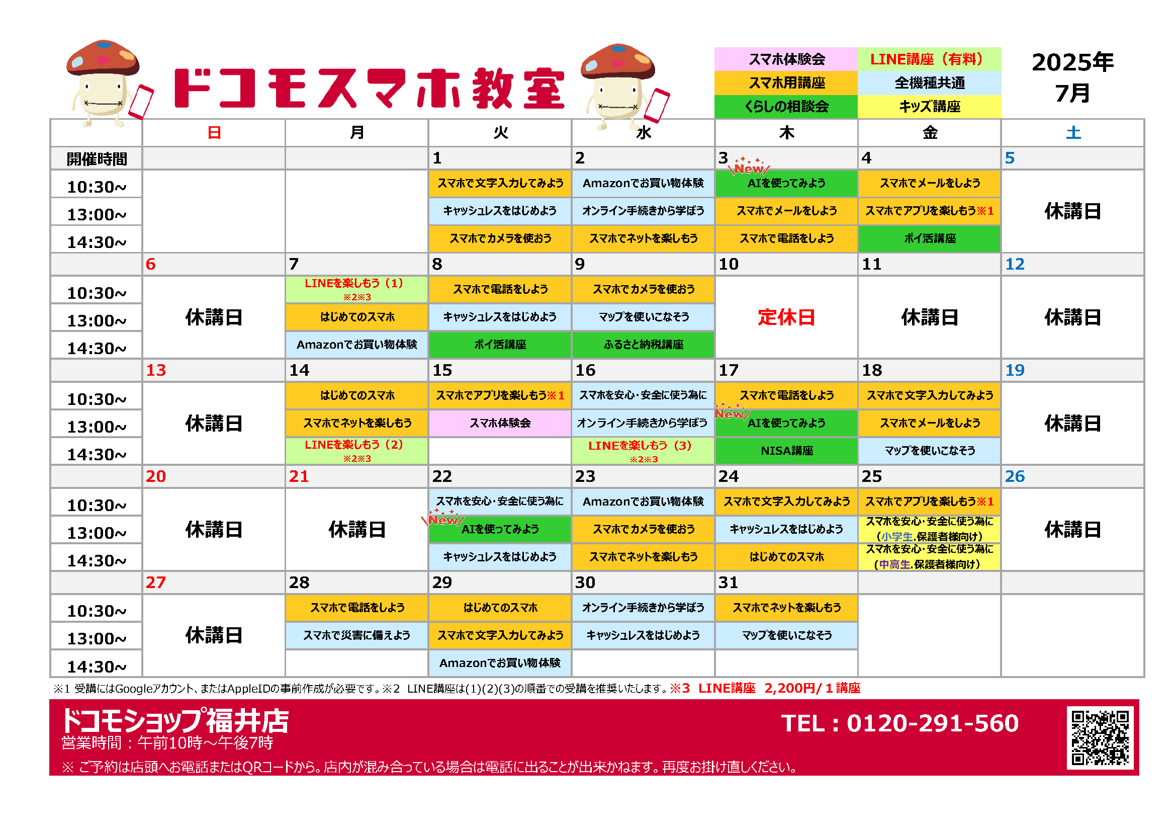 福井店・春江店・金津店・武生店の各ショップにて無料で開催中です。